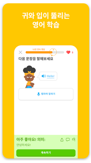 듀오링고는 단순히 단어를 암기하는 방식이 아니라, 게임처럼 재미있게 영어를 배울 수 있는 학습 시스템을 제공합니다. 앱을 켜면 짧은 문장으로 말하기, 듣기, 읽기, 쓰기를 자연스럽게 익히게 되며, 매일 꾸준히 연습할 수 있는 구조로 되어 있습니다. 이 덕분에 영어 초보자나 회화를 막 시작한 분들에게 특히 인기가 많습니다.