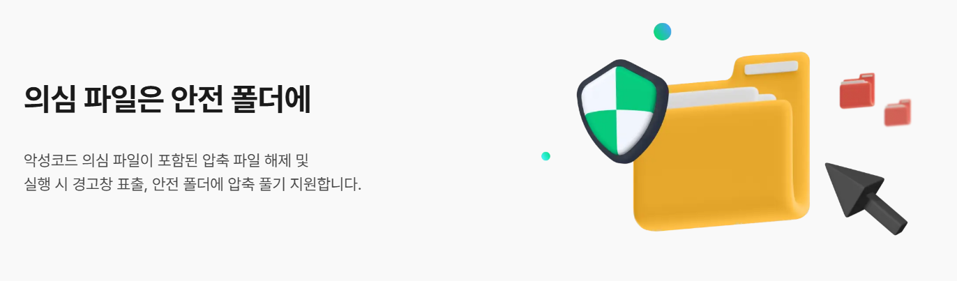 - 암호 설정 및 보안 기능: 압축 시 암호 설정 가능하며, 바이러스 검사 또는 의심 파일 안전 폴더 해제 기능이 탑재되어 있습니다.