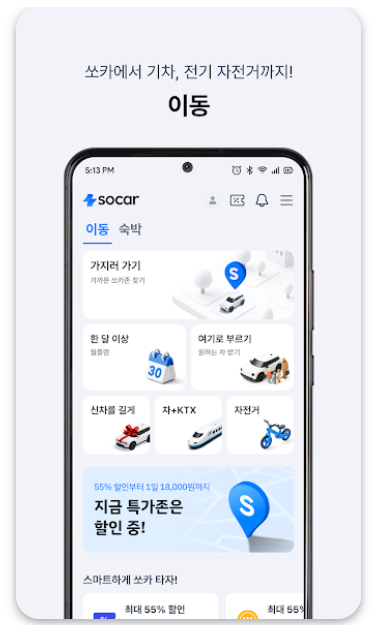 또한 쏘카는 단순히 차량만 빌려주는 것이 아니라, 기차와 연계된 쏘카-KTX, 전기 자전거 ‘쏘카일레클’, 장기 이용이 가능한 신차장기플랜과 월플랜 등을 통해 다양한 이동 솔루션을 제공하고 있습니다. 이처럼 사용자의 라이프스타일에 맞춘 폭넓은 서비스 확장이 쏘카 앱의 가장 큰 특징입니다.