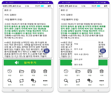 - 재생 제어 기능: 속도 조절, 문장 강조, 이어듣기 등 다양한 옵션 제공