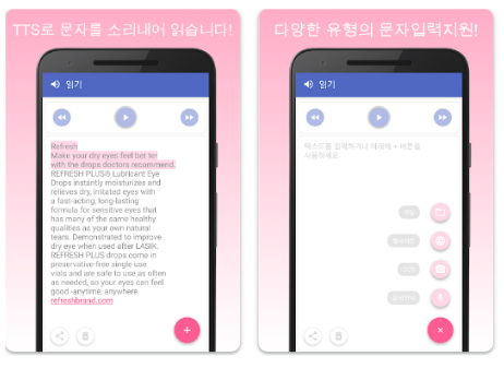 - "텍스트 음성변환 - 읽어주는 앱은 PDF, 전자책, 뉴스 등 다양한 입력 방식을 지원해 긴 글이나 종이 문서도 카메라 OCR로 쉽게 변환할 수 있어 편리하다는 후기가 많아요."