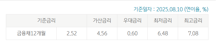 - 가산금리: 4.56% (개인 신용등급 및 대출기간에 따라 차등 적용)