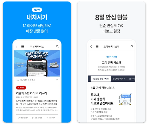리본카는 업계 최초 8일 환불 정책을 도입해 차량 구매 후 단순 변심에도 환불이 가능한 안심 서비스를 제공합니다. 또한, 구매 후에도 연장 보증과 찾아가는 점검 서비스를 통해 차량 관리까지 책임지는 플랫폼입니다.