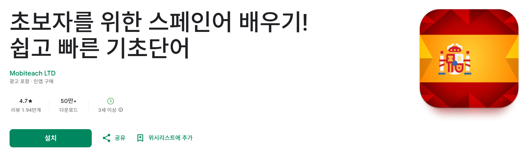 Mobiteach LLC에서 제공하는 이 앱은 4.7점의 평점과 1.7만 개 이상의 리뷰, 50만 이상의 다운로드를 기록했습니다. 초보자를 위해 쉽고 빠르게 스페인어 기초를 배울 수 있도록 설계된 것이 특징입니다.