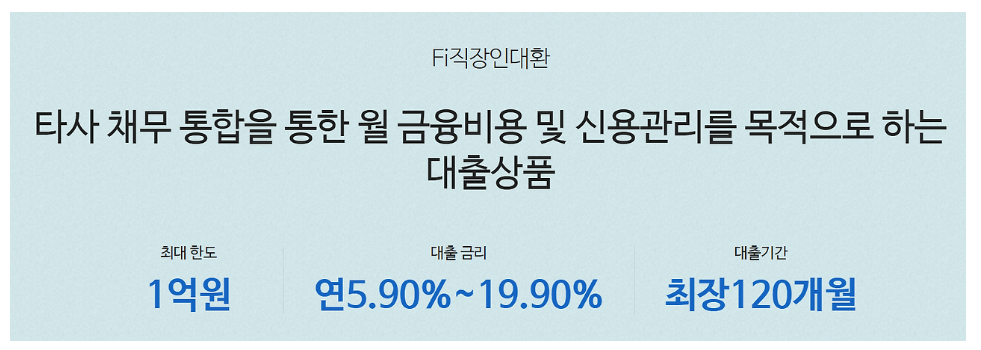 Fi직장인대환은 여러 금융기관의 채무를 하나로 통합하는 것이 목적입니다. 신용카드, 신용대출 등 다양한 채무를 합산하여 신청 가능하며, 일부 채무는 심사 기준에 따라 제외될 수 있습니다.